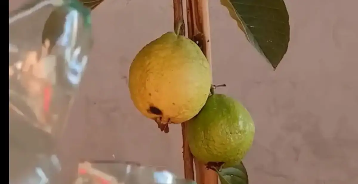 یک بلاگر برزیلی این روش را نشان می‌دهد. ابتدا یک بطری پلاستیکی بزرگ تمیز کنید. سپس با قیچی قسمت پایین بطری را جدا کنید. در ادامه با برش‌هایی در دهانه بطری دندان‌های ایجاد کنید. این دندان‌ها برای گرفتن میوه طراحی شده‌اند.