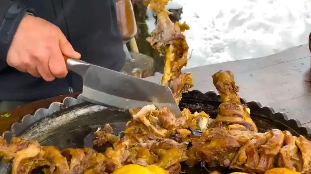 آشپز ماهر آذربایجانی در حال آماده کردن یک غذای سنتی با ران بره و سیب زمینی در هوای سرد و برفی است .او مواد لازم برای تهیه این غذای خوشمزه را به این ترتیب آماده و تهیه می کند. در ویدئو نحوه پخت این غذا را مشاهده کنید .
