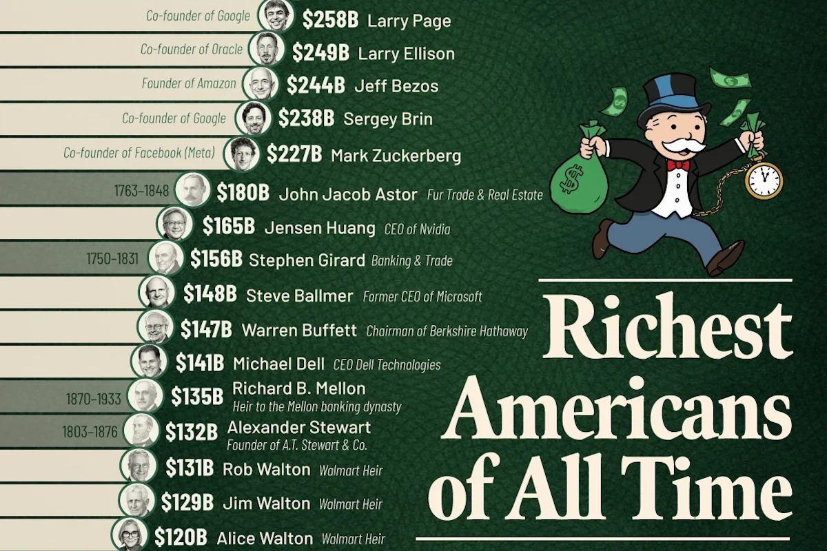 این اینفوگرافی، ثروتمندترین میلیاردرهای آمریکایی تاریخ را بر اساس ثروت آن‌ها و با تعدیل تورمی نسبت به دلار سال ۲۰۲۵ رتبه‌بندی می‌کند. داده‌های این تصویرسازی از بیزینس اینسایدر و بر پایه فهرست فوربس در سال ۲۰۰۷ از ثروتمندترین افراد تاریخ تهیه شده است. ثروت‌های تاریخی در اوج دارایی محاسبه و با استفاده از محاسبه‌گر تورم اداره آمار کار آمریکا به دلار سال ۲۰۲۵ تبدیل شده‌اند. دارایی افراد زنده نیز بر اساس برآورد فوربس تا تاریخ ۲۹ دسامبر ۲۰۲۵ است.