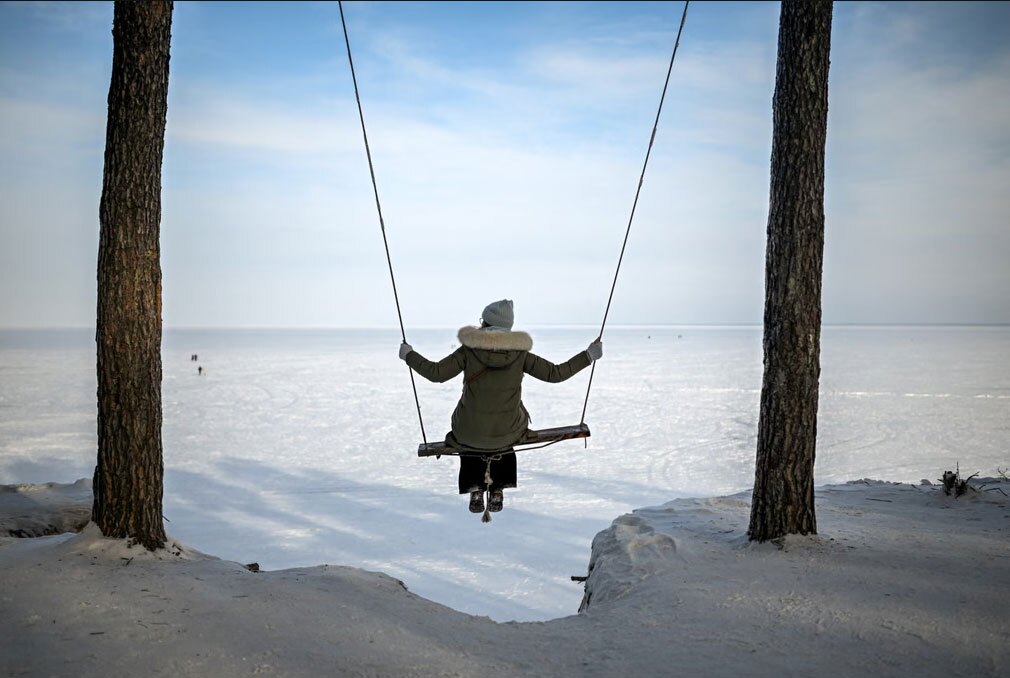 زنی در کنار مخزن یخ‌زده‌ی کی‌یف، (اوکراین) که به دریای کی‌یف نیز معروف است، تاب بازی می‌کند./ خبرگزاری فرانسه