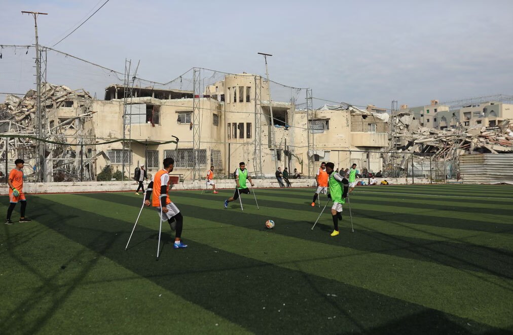 تمرین تیم فوتبال معلولان قطع عضو اراده غزه در زمینی که در اثر حملات اسرائیل متحمل خسارات شده است./ APA