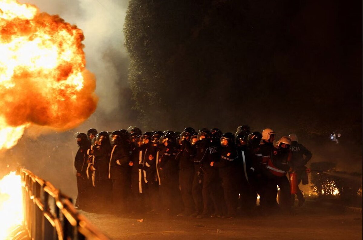 آتش زدن یک پمپ بنزین در جریان اعتراضات ضددولتی در پایتخت آلبانی/ رویترز