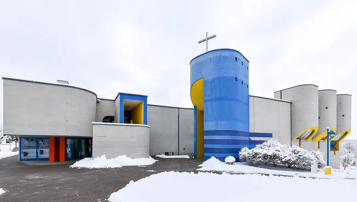 نمای بیرونی و بتنی کلیسای سنت آگاتا در بوخراین سوئیس، طراحی شده توسط معماران نایف به سبک مدرن بروتالیست در سال ۲۰۲۶.