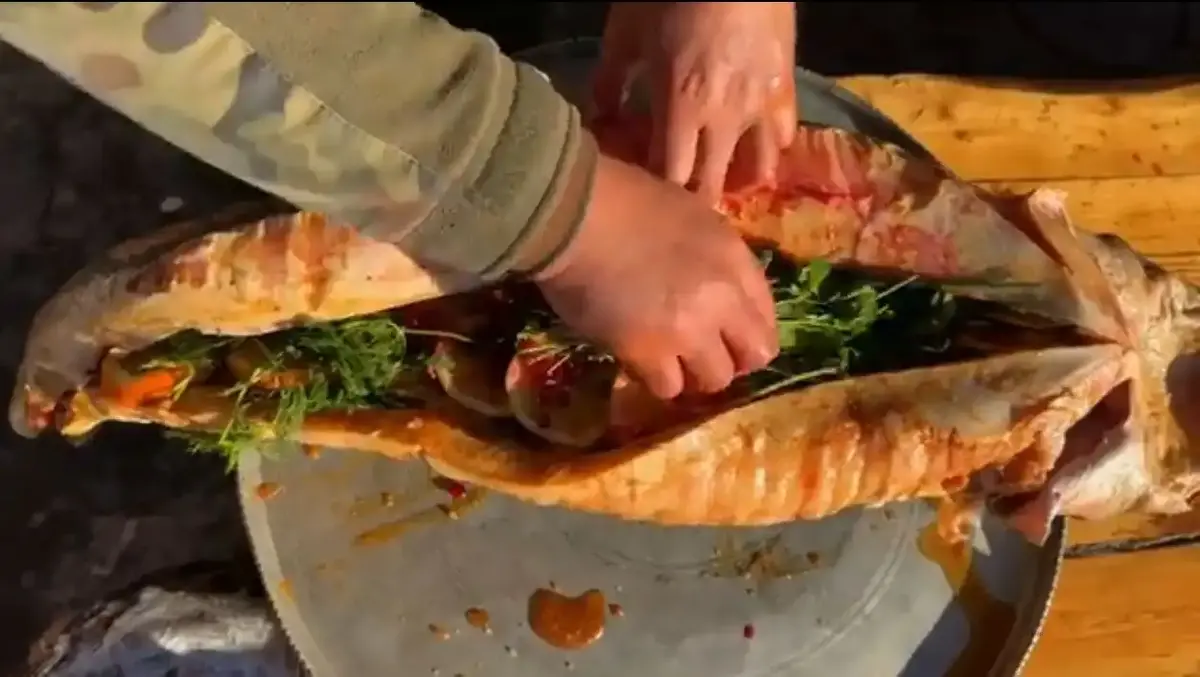 در این ویدئو یک آشپز ماهر ساکن یکی از روستاهای آذربایجان را میبینید که یک تاس ماهی غول پیکر را در بشکه کباب میکند. /فرادید