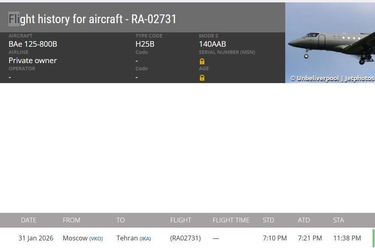داده های فلایت رادار 24 حکایت از ورود هواپیمای جت BAe 125-800B روسی (شماره ثبت RA-02731)، به تهران دارد. گفته می شود پویتن قبلا این هواپیما را در اختیار فرمانده کشته شدۀ گروه شبه نظامی واگنر - اوگنی پریگوژین - قرار داده بود ولی مشخص نیست بعد از پریگوژین اکنون چه کسی از آن استفاده میکند.