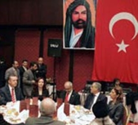 رهوا:رجب طیب اردوغان نخست وزیر عدالت طالب و مهرورز ترکیه در ضیافت علویان شیعه درماه رمضان شرکت کرده که عکس حضرت امام علی( ع ) در محل نصب شده است