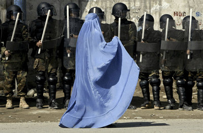 عبور زن افغان از روبه روی پلیس ضد شورش افغانستان