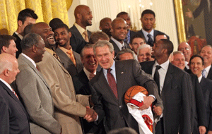 جرج بوش دستان "شکیل اونیل"، بسکتبالیست سیاهپوست آمریکا را برای مهار تروریست ها مناسب توصیف کرد.