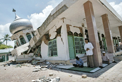 برغم تخريب در زلزله ، مسلمانان اندونزيايي د رمسجد فتح الرحمان مشغول عبادت هستند.