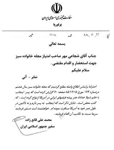 محمدعلي قانعزاده در تماس با نشريه خانواده سبز اعلام كرد كه: «در بررسيهاي به عمل آمده مشخص شد كه پسران هيچ كدام از سفراي سابق، با فرد مورد نظر ازدواج نكردند، من نميدانم اين اخبار كذب از كجا نشات گرفته است و سر منشا آن كجاست.»... پس آنچه كه مشخص است، اينكه شيلا خداداد با پسر سفير ايران در آفريقاي جنوبي ازدواج نكرده است، حال منتظر تماس شيلا خداداد هستيم كه اگر پاسخي براي اين خبر دارد، را بازگو كند و يا گفتگوي خود با نشريه مورد نظر را كذب بخواند... .