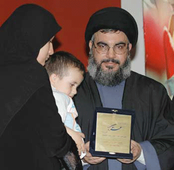 رهبر حزب الله در حال اعطاي لوح سپاس به همسر يك شهيد لبناني در بيروت