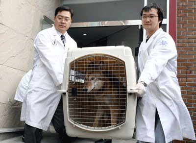 دو متخصص بيماري حيوانات در حال حمل ماده گرگ در دانشگاه سئول