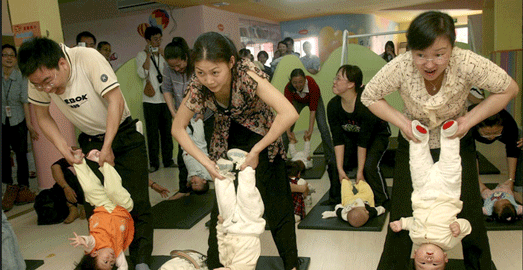 والدين در حال انجام تمرين يوگا روي كودكان در چين