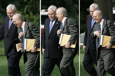 سه تصوير از كارل روو، مشاور سياسي كاخ سفيد (سمت راست) در كنار بيل مك گرن، مشاور رييس جمهوري  آمريكا(سمت چپ)
