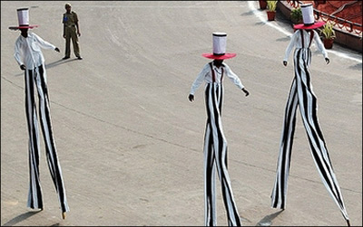 سه مرد هندي سوار بر پايه هاي چوبي  در روز سالگرد "اولين جنگ استقلال هند" – دهلي نو