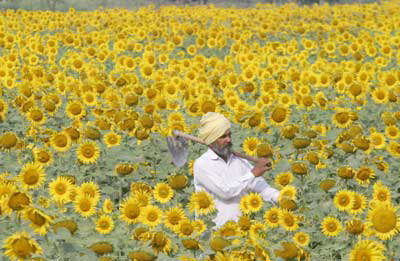 مرد هندي در مزرعه گل هاي آفتاب گردان، روستاي بانور – ايالت پنجاب