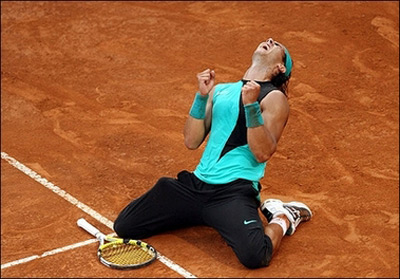 شادماني رافائل نادال، تنيسور اسپانيايي پس از غلبه بر نيكولاي داويدنكو روس، مرحله نيمه نهايي مسابقات تنيس مسترز رم