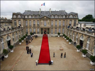 حیاط کاخ الیزه ؛ دارند برای "سارکوزی" فرش قرمز پهن می کنند - ساعتی قبل از آیین تحلیف