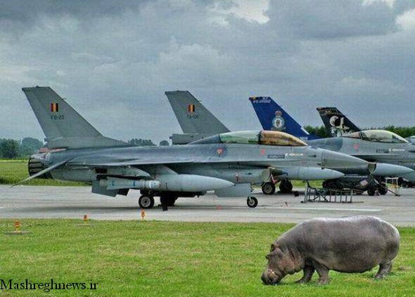 عکس/چریدن اسب آبی در کنار جنگنده ها!