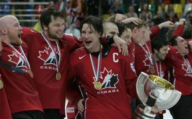 جشن بازيكنان تيم هاكي روي يخ كانادا پس از غلبه بر فنلاند و كسب عنوان قهرماني جهان - مسكو