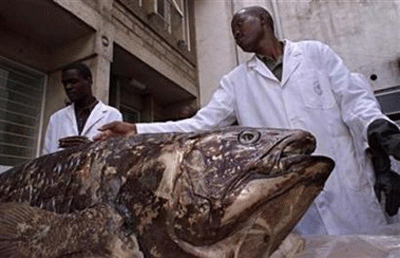 يك ماهي بزرگ سلكانت كه توسط ماهيگيران كنيايي صيد شده است