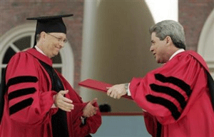 به گزارش روزنا به نقل از خبرگزاري آلمان "استيون هيمن " رئيس دانشگاه هاروارد در سخناني که در مراسم اعطاي درجه فارغ التحصيلي حقوق به گيتس ايراد گرد گفت : ما همگي اعتراف مي کنيم که مشهورتين عضو کلاس اين دانشکده در سال 1977 اصلا از اين دانشگاه فارغ التحصيل نشد.