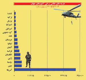 گفتني است، ميزان هزينههاي نظامي آمريكا در سال 2006 اندكي كمتر از كل توليد ناخالص داخلي كشور هلند بود. گزارش مذكور پيشبيني ميكند كه هزينهء عمليات نظامي آمريكا در جنگ عراق تا سال 2016 به رقم دو هزار و 267 ميليارد دلار خواهد رسيد.پس از آمريكا، كشورهاي انگليس (با 2/59 ميليارد دلار) و فرانسه (با 1/53 ميليارد دلار) از نظر هزينههاي نظامي مقامهاي دوم و سوم جهان را به خود اختصاص دادند. پس از آن، چين مقام چهارم جهان و مقام نخست آسيا را در اختيار دارد. اين كشور سال 2006 حدود 50 ميليارد دلار به خريدهاي تسليحاتي اختصاص داد.
