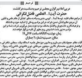 در آگهی هایی که بطور متوالی ، طی چندروز اخیر در روزنامه اعتماد ملی و برخی دیگر از روزنامه های اصلاح طلب منتشر شده است، از عموم "اساتید حوزه و دانشگاه، فرهیختگان، دانشجویان و اقشار مختلف مردم" دعوت کرده است که در مجلس ختمی که از طرف "آیت الله کروبی" برای مرحوم آیت الله العظمی فاضل لنکرانی منعقد کرده است، شرکت کنند.