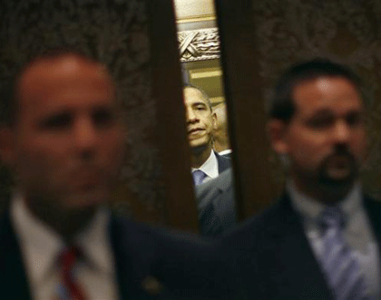 در همین رابطه امروز خبرگزاری رویترز در گزارشی تصویری محافظان گارد ریاست جمهوری امریکا که سایه به سایه اوباما حرکت می کنند تا از او مراقبت کنند را به نمایش در آورده است.