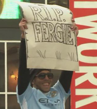کارلوس ته وز پس از قهرمانی منچسترسیتی در لیگ برتر انگلستان، در حرکتي که پوشش گسترده تلويزيوني داشت بنري را بالاي سر گرفت که روي آن نوشته شده بود: خدا تو را بيامرزد فرگي.