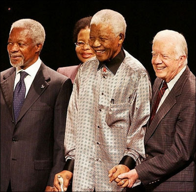 نلسون ماندلا (تصویر وسط) تولد 89 سالگی خود را در کنار جیمی کارتر (تصویر راست) و کوفی عنان (تصویر چپ) جشن می گیرد