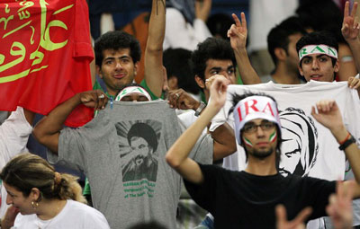 هواداران تیم ملی ایران در مالزی با پیراهن منقش به تصویر سیدحسن نصرالله