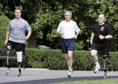 جرج بوش (وسط)، نیل دونسان، یک گروهبان ارتش آمریکا (چپ) و مکس رامسنی، یک کارشناس نظامی (راست) داخل کاخ سفید ورزش می کند