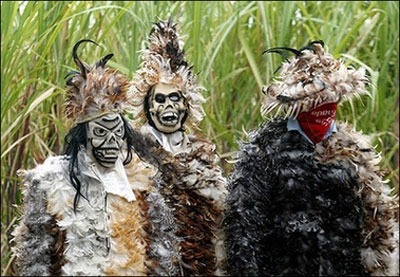 سه تن از بومیان پاراگوئه ای در لباس ساخته شده از پر مرغ - مراسم سنتی ادای احترام به "قدیس حامی بومیان"