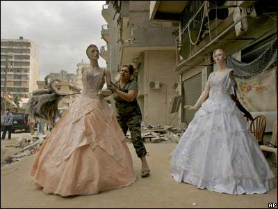 خانمي در جنوب بيروت در حال نظافت مانکن هاي زير بمباران مانده