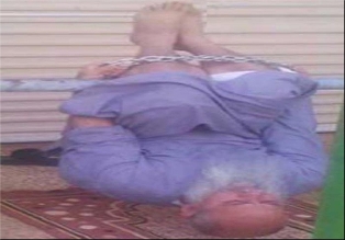 در ادامه این گزارش آمده است: همانطور که در تصویر مشاهده میکنید، مردی از دو پایش آویزان شده و دستانش هم به میلهای که دو پایش در آن زنجیر است، بسته شده است.
