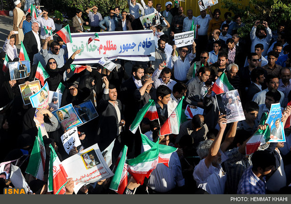 حامیان رئیس جمهور شعارهایی نظیر "صلی علی محمد یاور رهبر آمد"، "محمود دوستت داریم"، "احمدی ساده زیست، ریشه کن صهیونیست"، " چپ، راست، کارگزار، علیه خدمتگذار" و " احمدی زنده باد ، مشایی پاینده باد" سر می دادند.