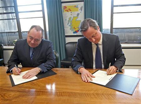 "دیوید کامرون" نخست وزیر بریتانیا و "الکس سالموند" نخست وزیر منطقه اسکاتلند روز دوشنبه توافقنامه ای را درباره جزئیات برگزاری همه پرسی استقلال اسکاتلند امضا کردند.