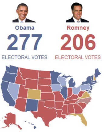 بر اساس این مدل اینفوگرافی اوباما با کسب 277 رای الکترال از رقیب جمهوریخواه خود که تنها قادر به کسب 206 رای الکترال است،پیشتازاست.