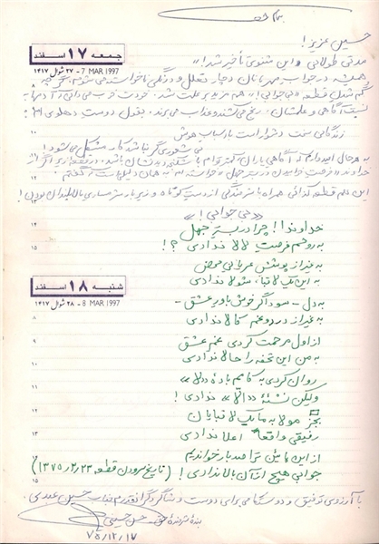 « تصویر دستخط سید حسن حسینی (برگی از دفتر حسین عبدی) »