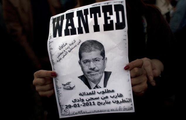 در پایین این تصویر نوشته شده است مرسی تحت تعقیب عدالت است و از زندان وادی در تاریخ 29/1/2011 فرار کرده است.