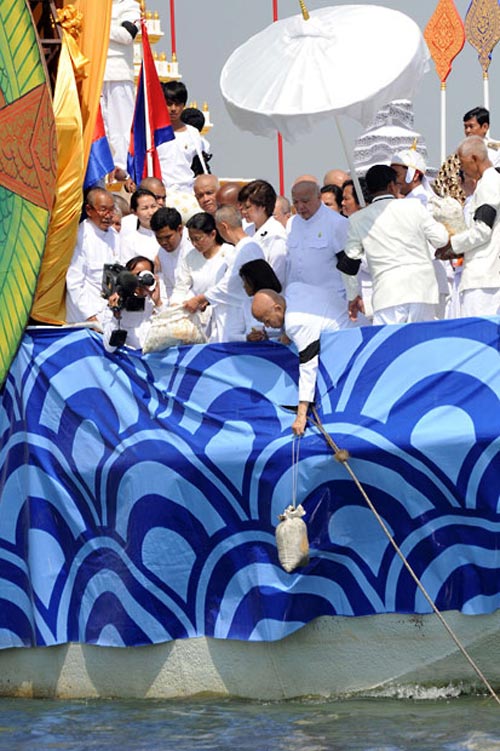 عصر ایران - خاکستر جسد سوزانده شده نوردون سیهانوک پادشاه فقید کامبوج از روی کشتی سلطنتی به آب رودخانه کامونگ انداخته می شود.