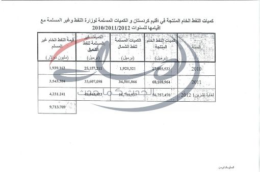 طبق اسناد منتشر شده در پایان سال 2011 تا ماه دوم 2012، اقلیم کردستان 56.757.470 بشکه نفت استخراج کرده که صرفا 16.711.537 بشکه به حکومت مرکزی عراق داده شده و 40.045.933 بشکه ناپدید شده که ارزش آن هم 4.231.241 دلار است .