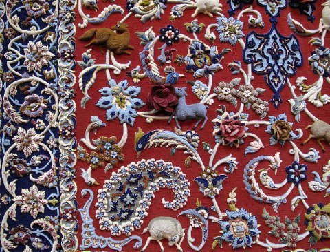 فرش باشکوه بوستان با نقوش برجسته، موجود در موزه فرش اثر استاد "علی خدادادی" بافته شده در سال 1356