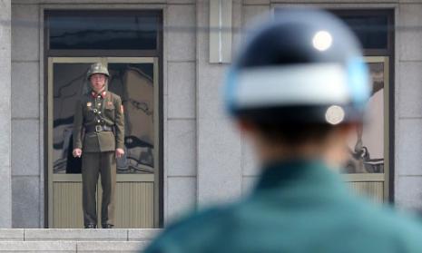 عصر ایران - دو نظامی کره جنوبی (راست) و کره شمالی رو در روی یکدیگر در منطقه مرزی خلع سلاح شده "بانمونگوم" میان دو کشور. (منبع خبرگزاری فرانسه)