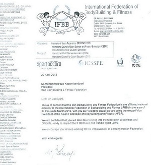در ادامه این نامه آمده است : ما مطمئن هستیم شما می‌توانید همه ورزشکاران و مسئولان این رشته در ایران را سر و سامان دهید و قوانین IFBB را به خوبی اجرا کنید .