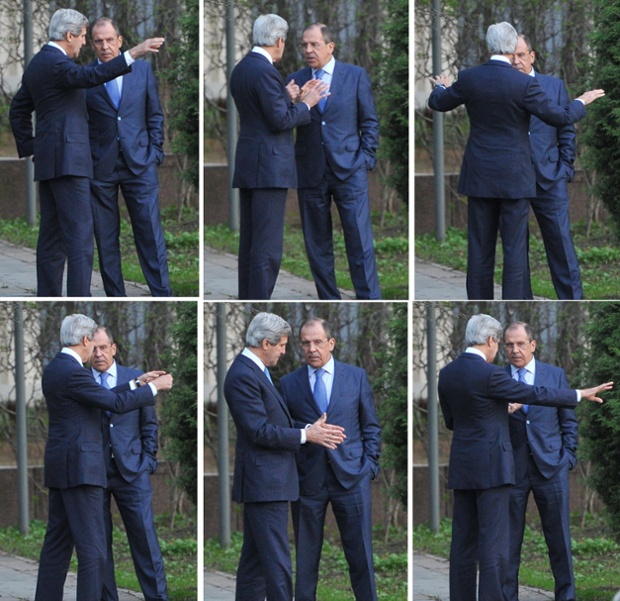 عصر ایران - جان کری وزیر امور خارجه آمریکا در محوطه باغ ساختمان وزارت خارجه روسیه در مسکو در حال گفتگو با " سرگئی لاوروف " همتای روس خود درباره بحران سوریه است. آمریکا تلاش دارد تا مسکو سیاست خود را در حمایت از حکومت بشار اسد تغییر دهد.