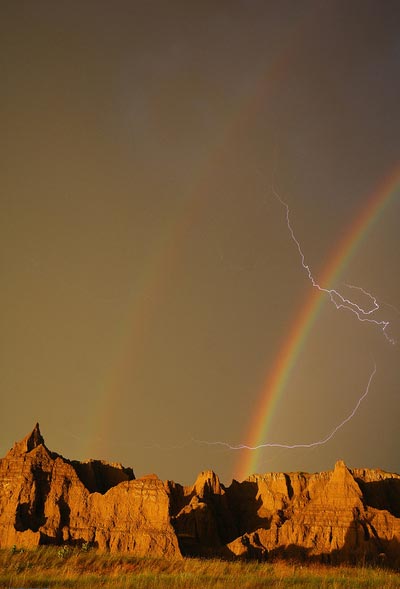 یک منظره نایاب از عبور برق آسمان از خلال رنگین‌کمان دوگانه (double rainbow) در آسمان پارک ملی بادلندز واقع در داکوتای جنوبی، شکار شد.