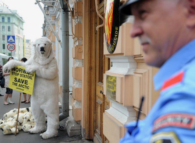 اجتماع طرفداران محیط زیست در مقابل دفتر شرکت نفتی استات اویل در مسکو در اعتراض به اکتشافات نفتی این شرکت در قطب