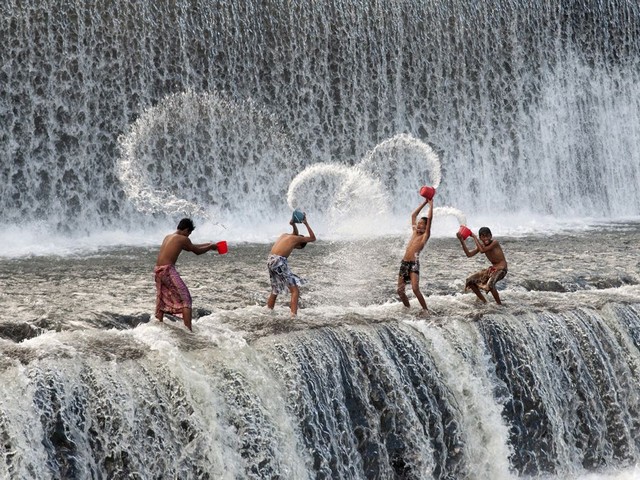 بازی نوجوانان در کناره آبشار یک رود در بالی اندونزی